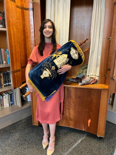 Hannah at the bimah in her tallit she made herself